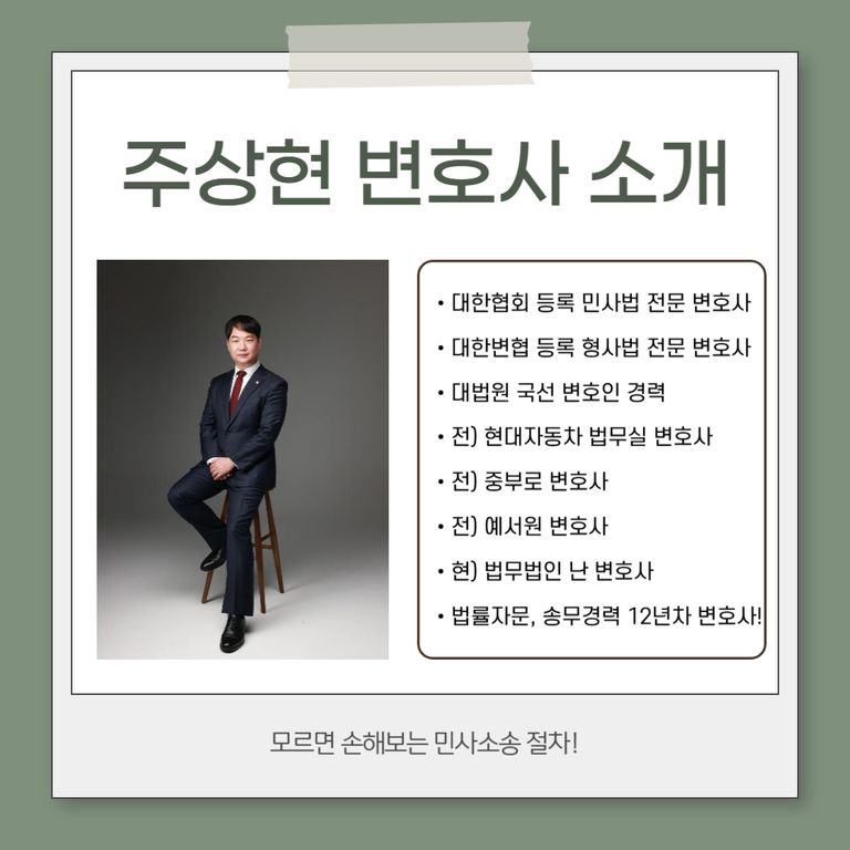 주상현 변호사는 민사법 전문 변호사입니다. 민사소송 진행 및 수임과 관련하여 법적 조력이 필요하시면 언제라도 연락주시기 바랍니다.