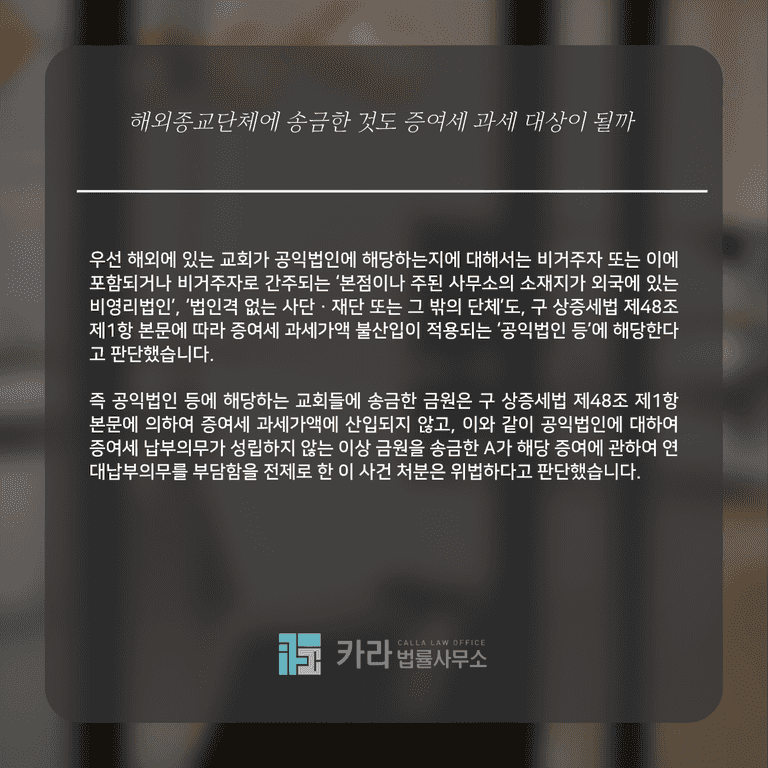 A씨가 해외에 있는 다수의 교회들에 금원을 송금한 것에 대하여 과세관청이 연대납부의무자로서 증여세를 부과하자 A씨는 해당 교회들은 구 상증세법 제48조 제1항에서 정한 공익법인 등에 해당한다며 증여세 과세 처분을 취소해달라는 소송을 제기했습니다.