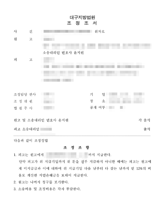 여기서 중요한 점은, 조정조서가 단순한 합의서가 아니라는 사실입니다. 법률상 조정조서는 '확정판결과 동일한 효력'을 갖습니다. 이는 만약 피고가 약속한 날짜에 위자료를 지급하지 않을 경우, A씨는 별도의 소송 없이 이 조정조서를 근거로 즉시 피고의 재산에 대한 강제집행(압류 등)을 신청할 수 있음을 의미합니다. 이처럼 조정은 단순한 화해가 아니라, 법의 강제력이 뒷받침되는 강력하고 실효성 있는 분쟁 해결 방식입니다.