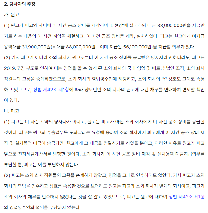 원고는 피고와 장비 제작 및 설치계약을 체결하고 피고가 일부대금을 지급한 점, 세금계산서를 발행한 점을 토대로 원고와 피고가 이 사건 계약의 당사자라고 주장하였고, 피고와 피고의 형이 설립한 법인의 이름이 같다는 점 등을 토대로 상호속용에 의한 영업양수인의 책임을 주장하였습니다(상법 제42조 제1항).