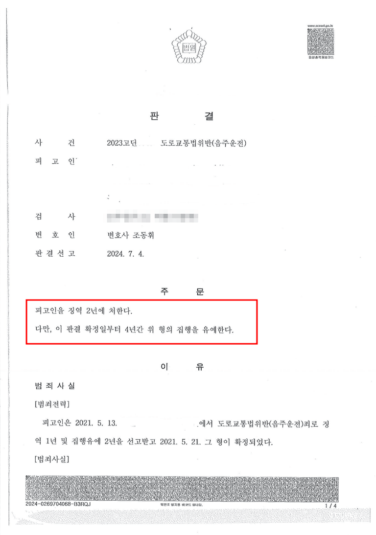 의뢰인께서 과거 음주운전으로 징역 1년에 집행유예 2년을 선고받은 상태에서, 집행유예 기간 중 또다시 음주운전을 하다 단속에 적발되신 사건입니다. 집행유예 기간 중 재범은 기존 형량과 함께 가중처벌되어 실형이 불가피한 상황이었으며, 의뢰인께서는 가족과의 분리를 피하고 사회생활을 지속할 수 있는 집행유예 판결을 간절히 원하고 계셨습니다.