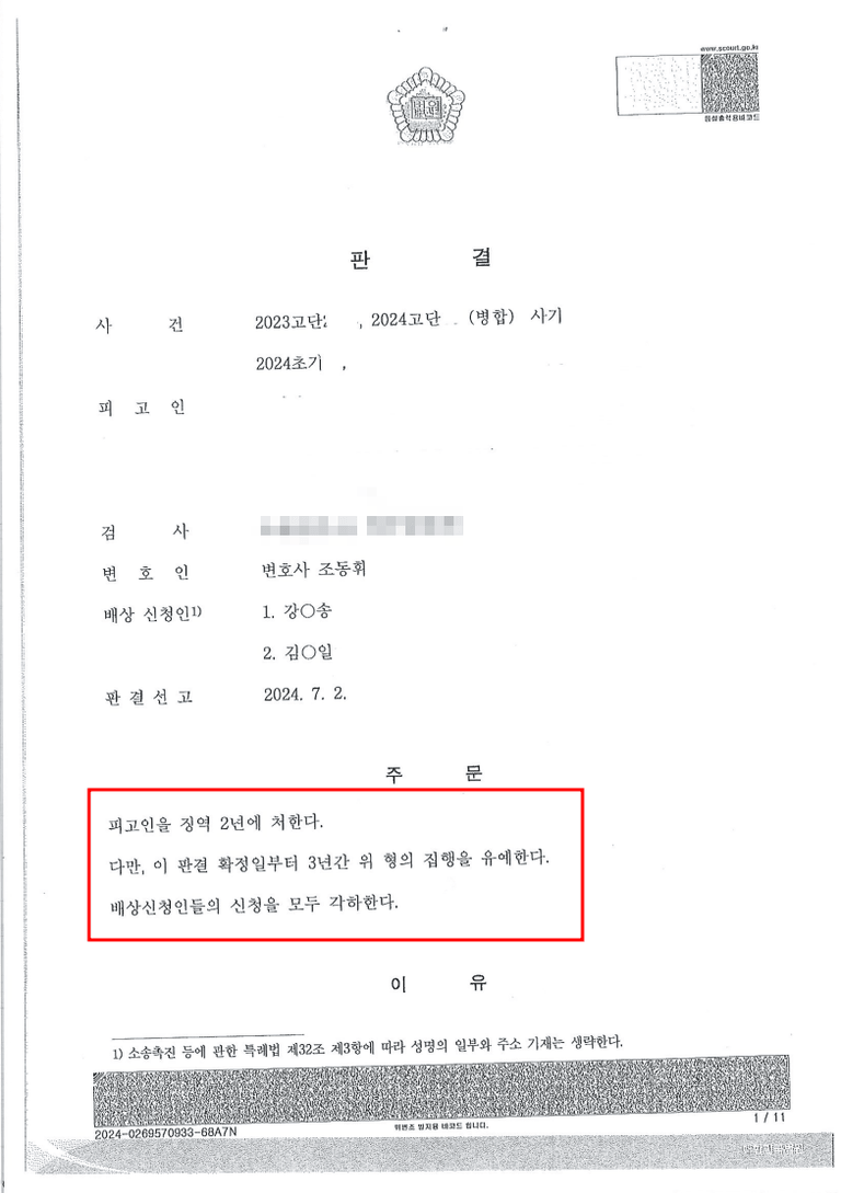 구속영장 심사에서 영장이 기각되어 불구속 상태에서 재판을 진행할 수 있었습니다. 최종 재판에서는 의뢰인의 절실한 상황과 범죄 인식 부재, 그리고 진정성 있는 반성 태도가 인정받아 징역 2년에 집행유예 3년이라는 선처를 받을 수 있었습니다. 피해금액이 2억원을 넘어가는 중대한 사건임에도 불구하고 실형을 면하고 사회 복귀의 기회를 얻을 수 있었던 것은 의뢰인의 직업적 신분을 지킬 수 있게 해준 최선의 결과였습니다.