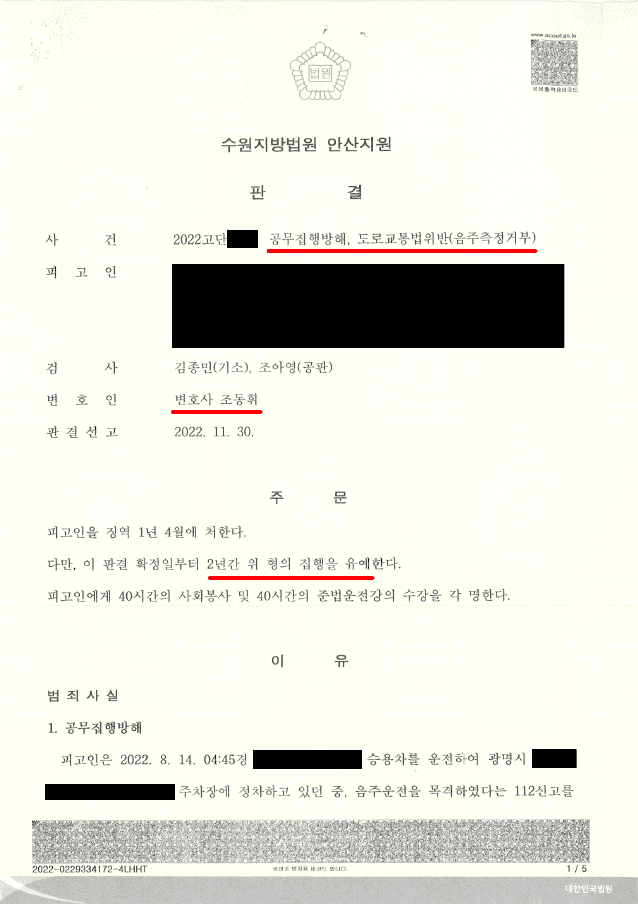 징역형을 피하고 집행유예라는 선처를 받을 수 있었습니다. 음주운전 재범에 공무집행방해, 측정거부죄가 더해진 중한 사안임에도 불구하고 의뢰인의 요구사항인 실형 회피를 성공적으로 달성한 만족스러운 결과였습니다. 의뢰인께서는 신분상 문제없이 일상생활을 지속할 수 있게 되었습니다.