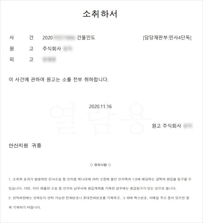 모든 임차인들이 자발적으로 퇴거함에 따라 소송의 목적이 달성되어 소취하서를 제출할 수 있었습니다. 강제집행에 따른 막대한 비용과 시간을 절약할 수 있었고, 보증금에서 각종 비용을 공제한 후 나머지 금액만 반환하는 방식으로 의뢰인의 경제적 손실을 최소화했습니다. 무엇보다 건물을 신속하게 회수하여 정상적인 수익 창출이 가능하게 된 만족스러운 결과였습니다.