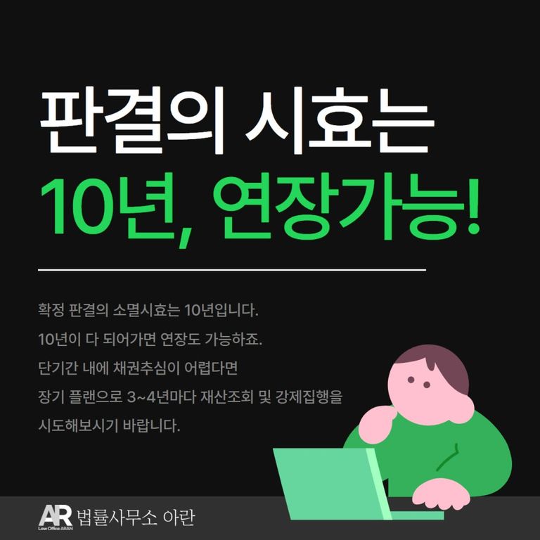 승소 판결의 효력은 10년입니다. 하지만 10년씩 계속해서 연장할 수 있습니다.