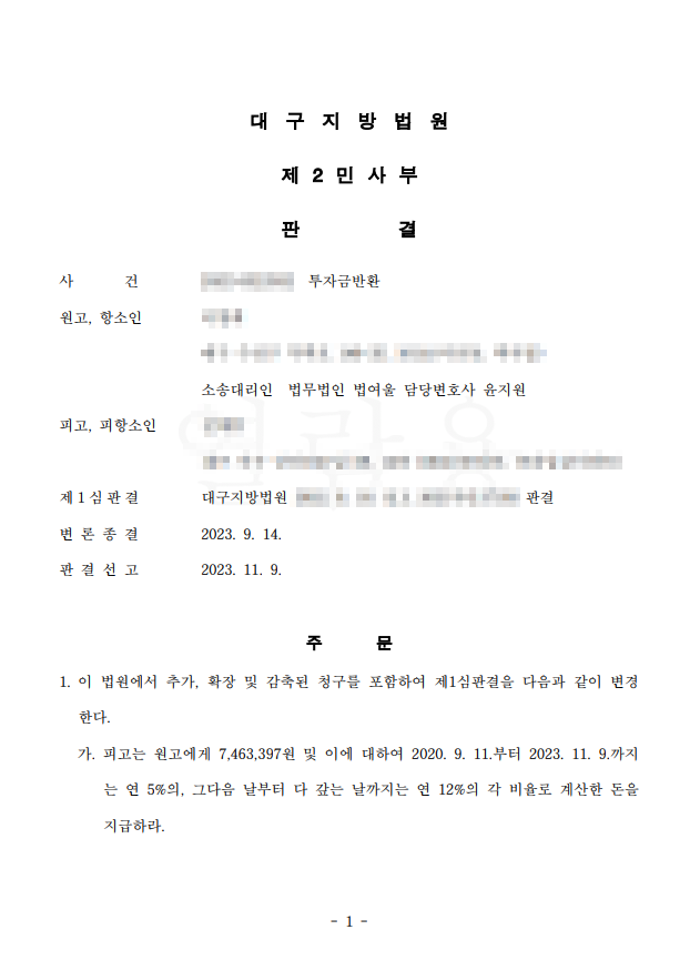 의뢰인의 송금내역을 면밀히 검토하여, 의뢰인이 피고에게 입금한 투자금 중에서 일부는 수익금이 전혀 입금되지 않은 점을 정리하여, 의뢰인이 피고에게 각 입금한 투자액 중에서 약 14,000,000원에 대해서는 수익금과 원금도 전혀 입금되지 않은 점을 항소이유서에 기재하였으며, 청구원인을 피고의 편취 뿐만 아니라 유사수신행위의 불법행위를 이유로 한 손해배상청구로 수정하였고, 청구금액도 감축하였습니다.