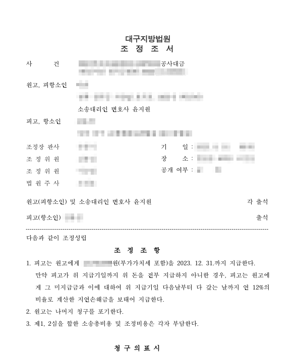 원고와 원고의 소송대리인, 피고는 조정 기일에 출석하여 피고는 원고에게 소장의 청구취지 금액에 부가가치세를 포함한 금액을 해당 연도 말일까지 지급하기로 조정이 성립되었습니다.