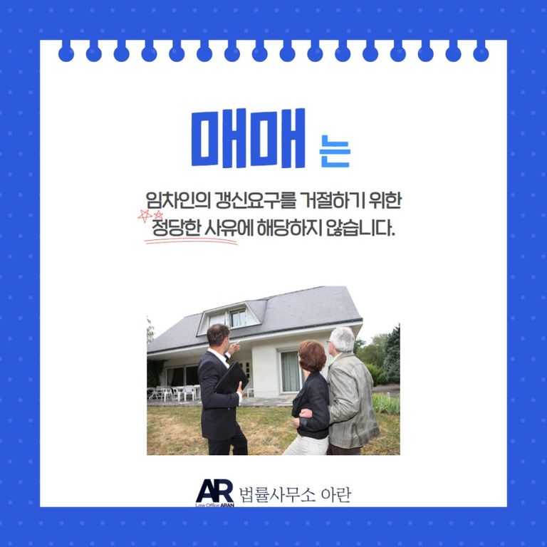 매매 예정이라는 이유로는 임차인의 계약갱신청구권을 거절할 수 없습니다.