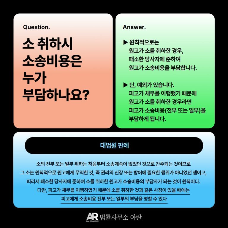 민사소송법상 소송비용은 패소한 사람이 부담하게 됩니다. 그런데 소를 취하하는 경우에는 승소한 쪽과 패소한 쪽이 구분되지 않기 때문에 누가 소송비용을 부담하여야 하는지가 문제가 됩니다.