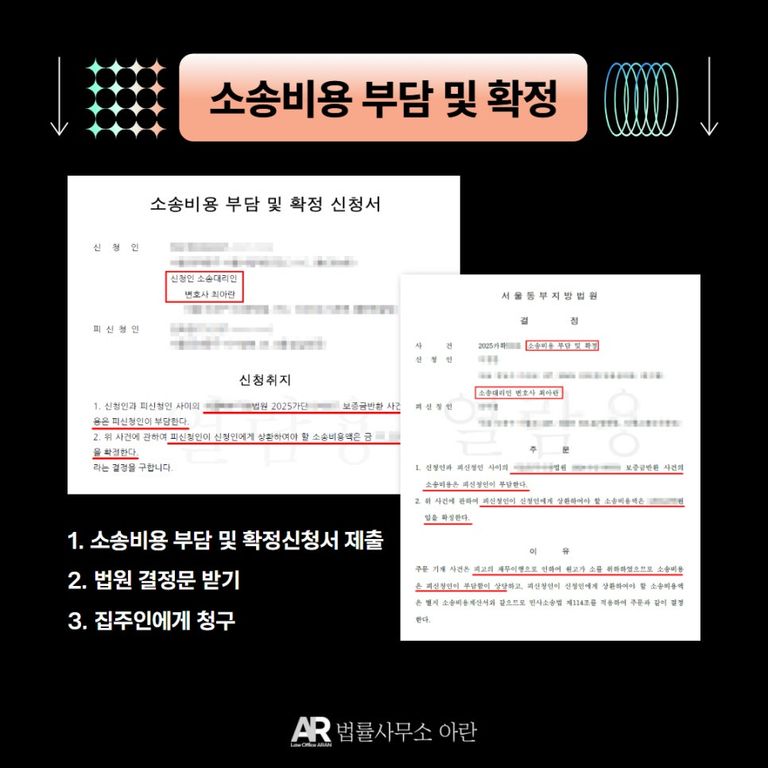 실제로 법률사무소 아란에서는 세입자를 대리하여 소송비용 부담 및 확정 재판을 신청하여 절반 내지 전액의 소송비용을 집주인에게 부담시켜 왔습니다.