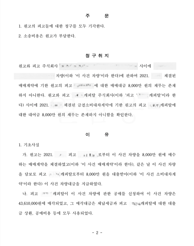 의뢰인은 매수인인 원고와 자동차 매매계약을 체결하고 자동차를 인도하였는데 원고는 갑자기 의뢰인과의 이 사건 매매계약은 자신의 애인이 자신의 명의를 도용/위조하여 체결한 것이므로 무효라고 주장하며 이 사건 채무부존재확인의 소를 제기하여 의뢰인은 저를 찾아오셨습니다.