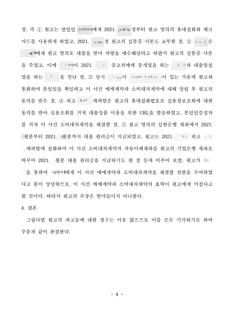 저는 즉각 응소하여 이 사건 계약의 경위, 원고가 휴대전화, 신분증, 체크카드 등을 애인에게 교부한 점, 피고는 이 사건 계약 체결 당시 원고에게 전화하여 동의를 받은 점 등을 주장 입증하였고 법원은 원고 청구를 기각하였습니다.