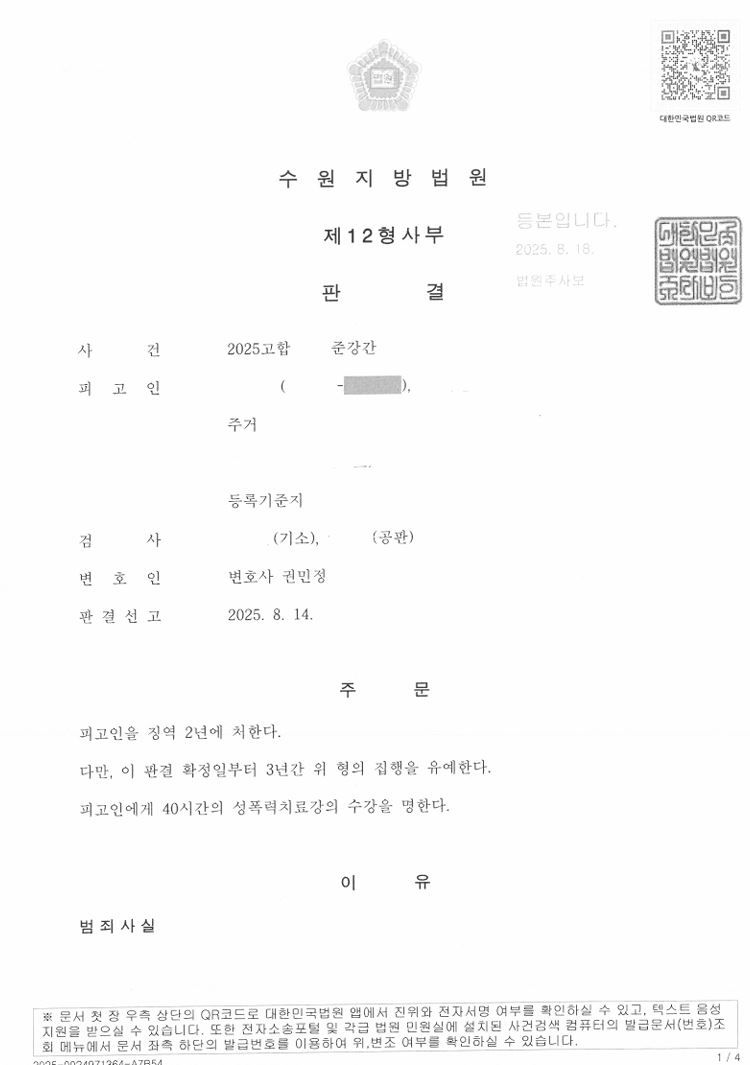 그 결과 재판부에서는 피고인에게 집행유예를 선고하는 선처를 내렸습니다.