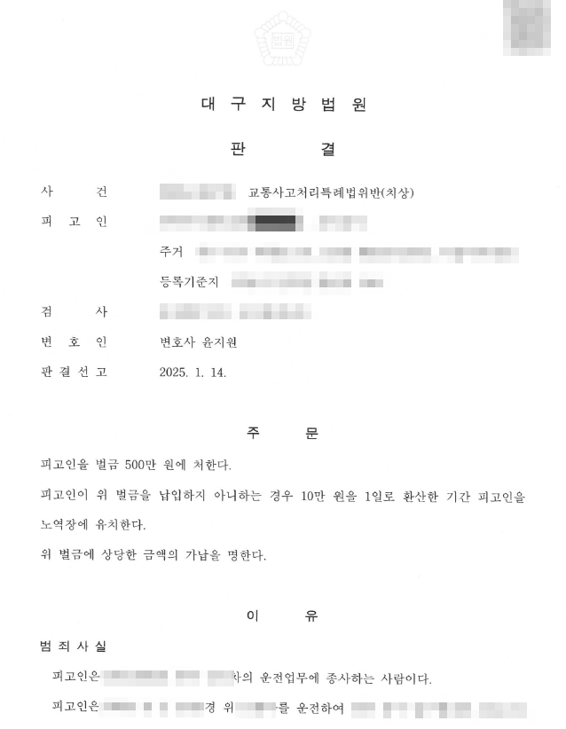 변론의 가장 결정적인 전환점은 '운전자 보험'을 활용한 형사 합의였습니다. 경제적 어려움으로 거액의 합의금 마련이 어려웠던 운전자는, 가입해 둔 운전자 보험을 통해 피해자에게 형사 합의금을 지급할 수 있었습니다. 이 합의로 피해자로부터 "가해자의 형사처벌을 원치 않는다"는 내용이 명시된 합의서를 받을 수 있었고, 이는 재판에서 가장 중요한 감경 요소로 작용했습니다.