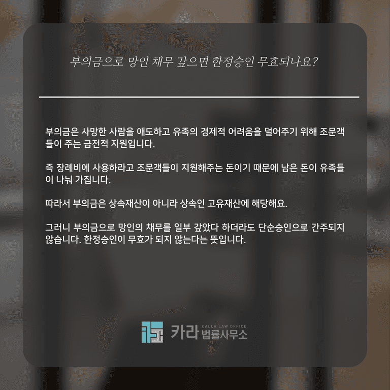 그러니 부의금으로 망인의 채무를 일부 갚았다 하더라도 단순승인으로 간주되지 않습니다. 한정승인이 무효가 되지 않는다는 뜻입니다.