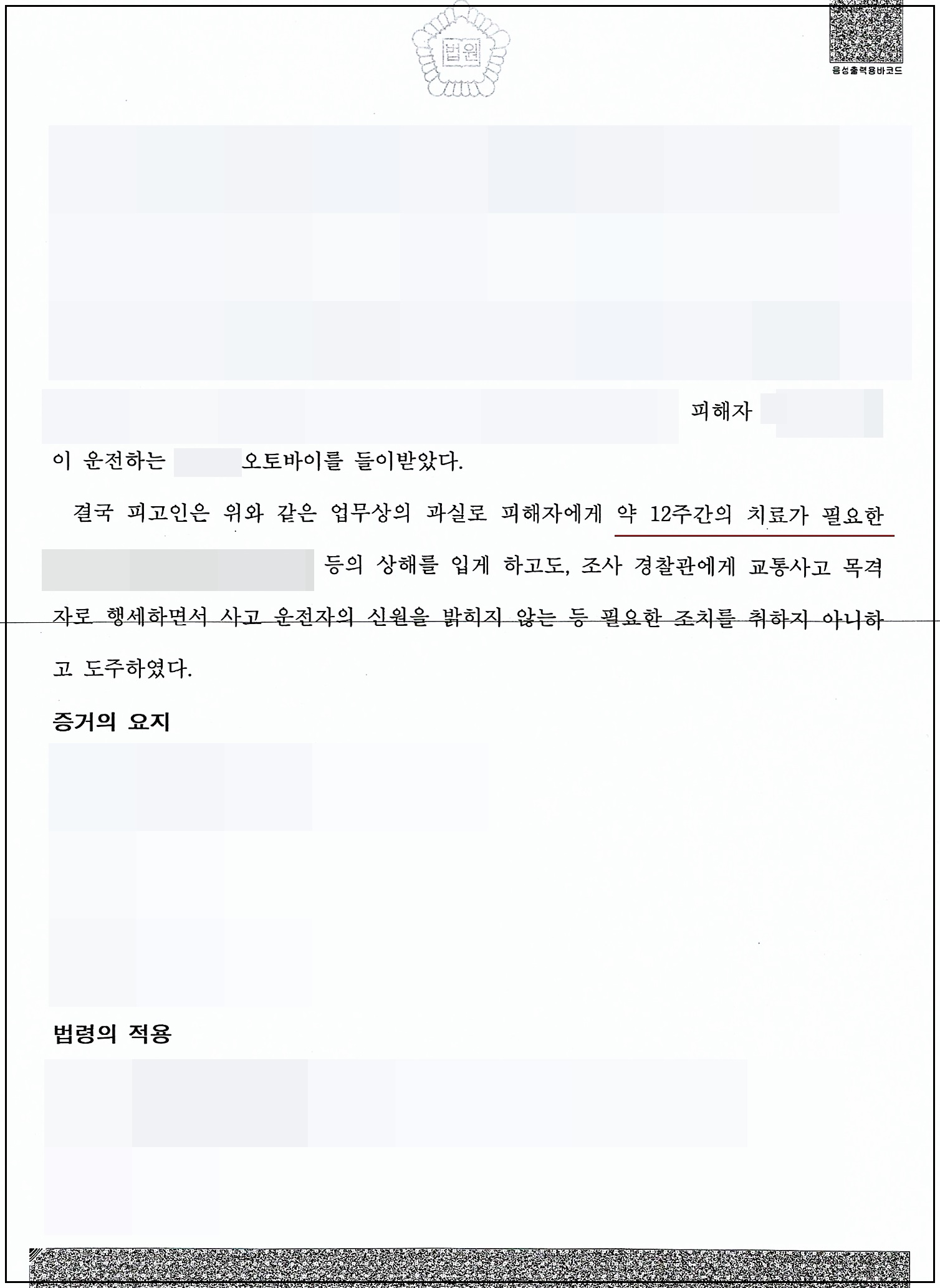 자신의 차량으로 오토바이 운전자를 치어 약 12주간의 치료를 요하는 제1목척추뼈의 폐쇄성 골절 등의 중대한 상해를 입히고도 가해자가 아닌 목격자로 행세하며 뺑소니 범행[#특정범죄가중처벌등에관한법률위반(도주차량), #특정범죄가중처벌등에관한법률위반(도주치상)]을 부인하였으나, 나중에는 변호인의 설득에 자백하였습니다(대법원 판례에 의하면 가해자임에도 목격자 행세를 하면 뺑소니에 해당한다).