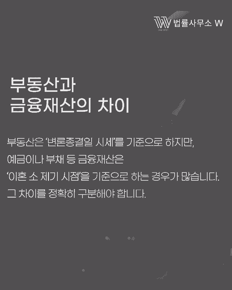 부동산·주식과 달리 금융재산(예금·부채 등)은 변동성이 적고 특정이 가능하기 때문에, 보통 혼인관계 파탄 시점(예: 별거 시작일)을 기준으로 평가합니다. 따라서 집값과는 달리 소송 중 변동된 금액은 인정되지 않습니다.
