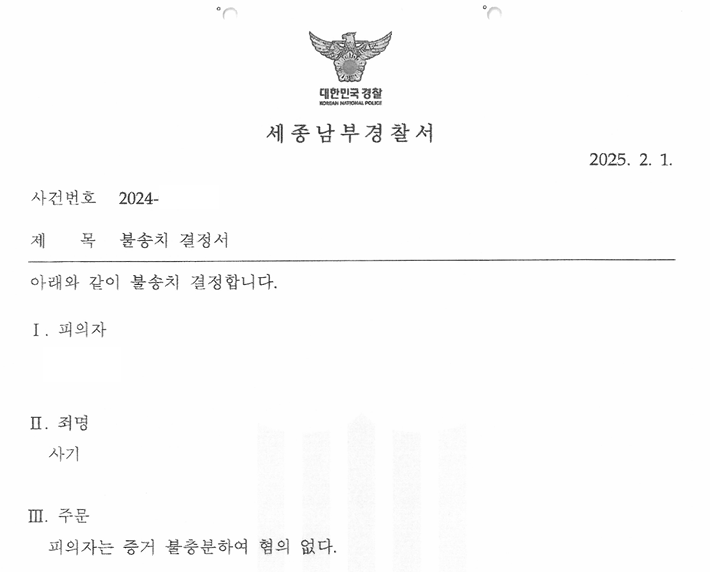 위와 같은 조력의 결과 고소인의 일방적인 주장과 달리, 의뢰인은 경찰로부터 불송치(혐의없음) 결정이라는 최선의 결과를 받고 억울한 상황에서 벗어날 수 있었습니다.