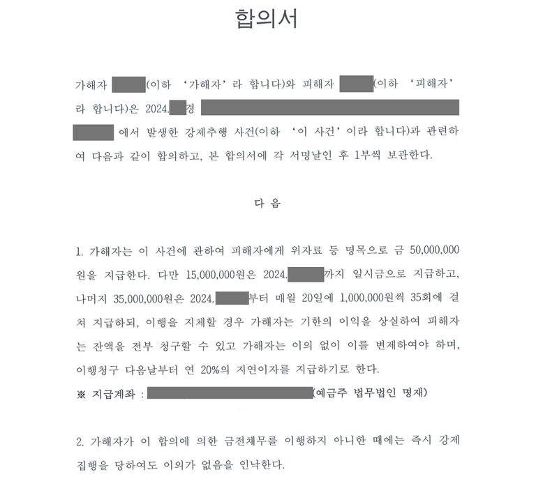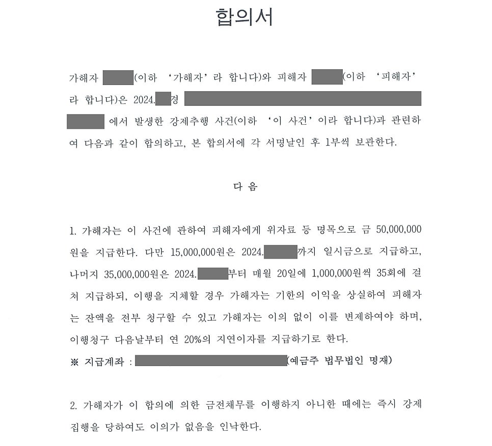 형사고소 및 민사소송을 제기하지 않는 조건으로 합의금 지급 협상