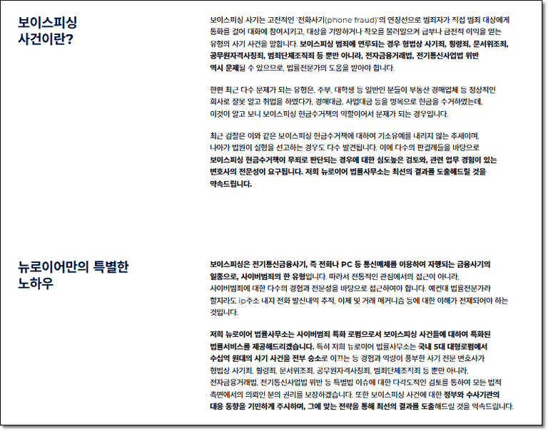 최근 보이스피싱 범죄는 기존의 단순 전화 사기를 넘어, 작업대출, 스마트폰 원격 조작, 가짜 앱 설치, 가상화폐 연계 금융사기 등 그 수법이 더욱 다양하고 정교해지고 있습니다. 이러한 신유형의 사이버 범죄는 전통적인 법률 해석만으로는 부족하며, 사이버 분야에 대한 깊은 이해와 현장 감각이 병행되어야만 제대로 대응할 수 있습니다. 바로 이 부분이 저희 뉴로이어의 강점인데요.