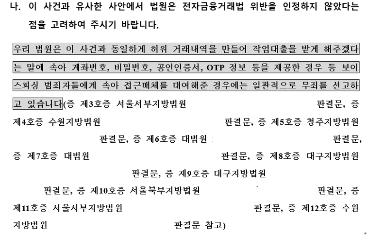 실제 저희가 제출한 전자금융거래법 위반 변호인의견서 중 일부