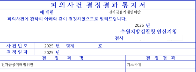 저희 뉴로이어 법률사무소는 치밀한 법리 분석과 체계적인 주장 전개를 통해, 이번 사건에서 의뢰인에 대한 전자금융거래법 위반 혐의에 대해 검찰로부터 '기소유예 처분'을 이끌어낼 수 있었습니다.