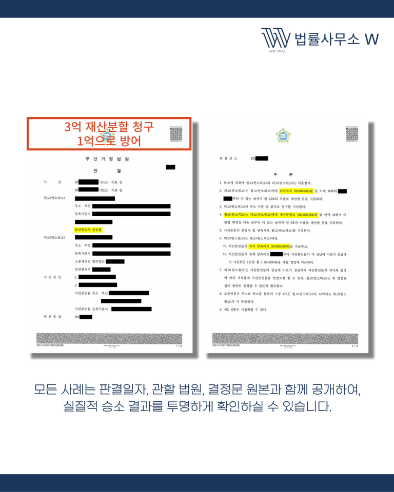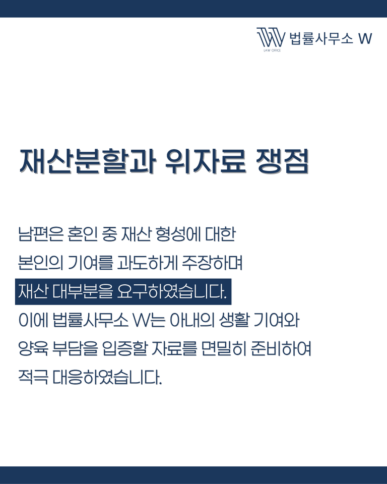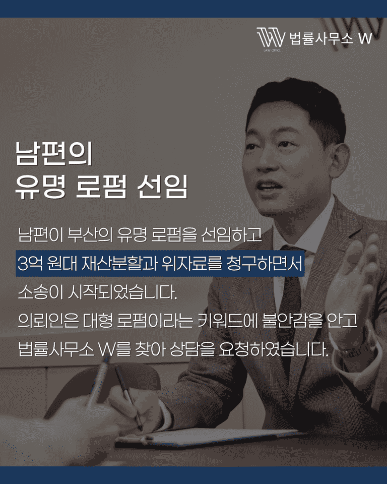이번 사건에서 남편은 부산 지역의 유명 로펌을 선임하여 3억 원대의 재산분할과 위자료를 청구했습니다. 규모 있는 로펌이 개입한 만큼 아내가 불리할 것이라는 우려가 있었지만, 저희 법률사무소 W는 사건의 핵심 쟁점을 철저히 파악하고 전략적으로 대응했습니다.