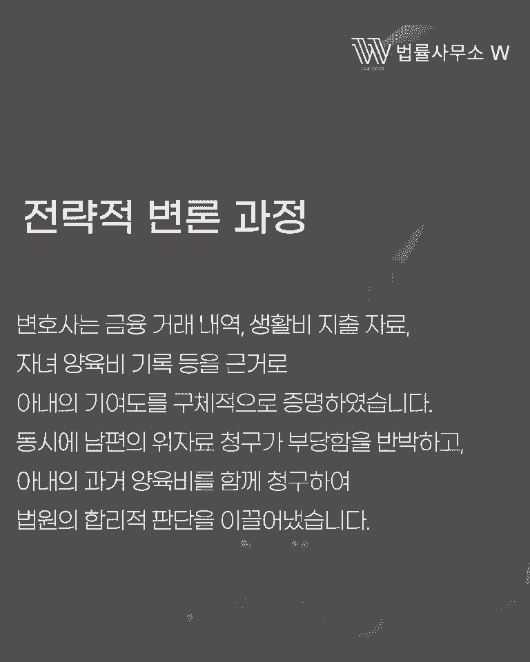또한 남편이 청구한 위자료 부분에 대해서도, 아내가 혼인 파탄에 책임이 없다는 사실을 구체적인 증거로 소명하였습니다. 아울러 과거 양육비 문제까지 함께 다투어, 아내가 오히려 정당한 권리를 인정받을 수 있도록 변론했습니다.