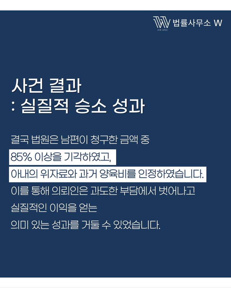 법원은 남편의 주장을 대부분 받아들이지 않았습니다. 3억 원이 넘는 청구액 가운데 실제 인정된 부분은 일부에 불과했고, 위자료와 과거 양육비는 오히려 아내의 손을 들어주었습니다. 결국 남편 측 청구액의 약 85% 이상이 기각되었으며, 아내는 불필요한 경제적 부담에서 벗어나면서도 정당한 권리를 인정받을 수 있었습니다.