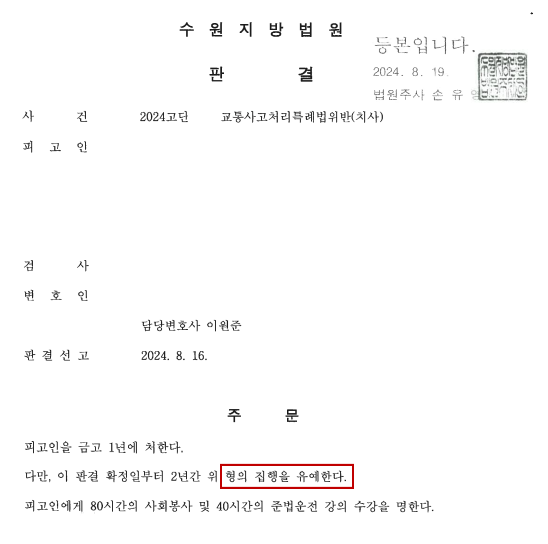 위와 같은 조력의 결과 의뢰인이 실형을 면하고 집행유예라는 결과를 받을 수 있었습니다.
