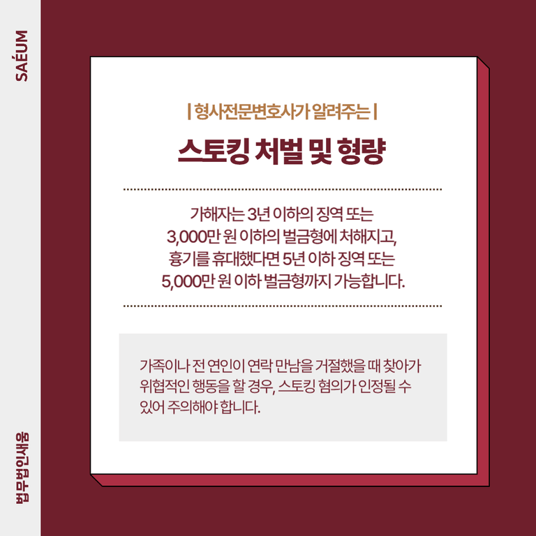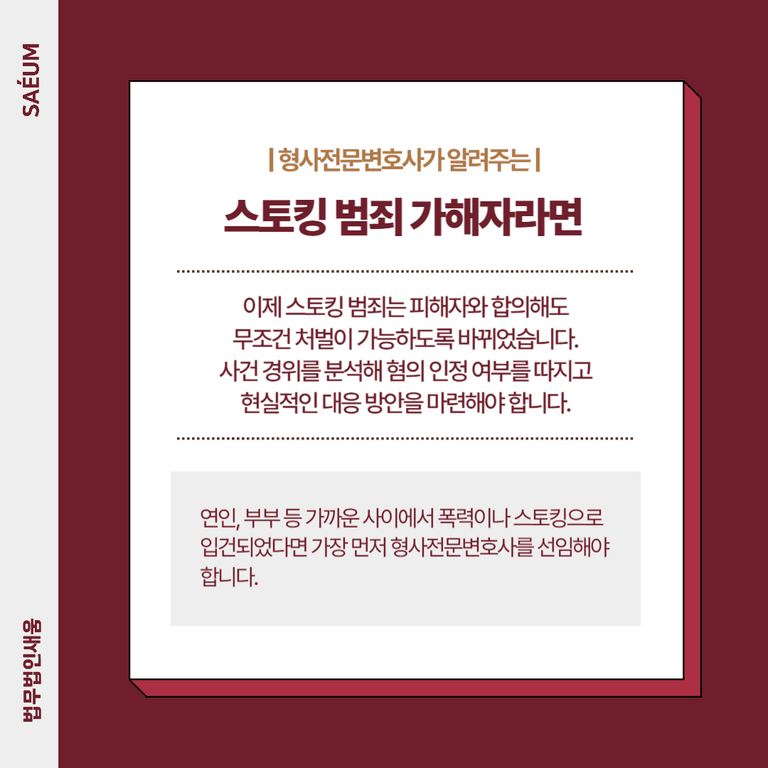 특히 스토킹의 경우 단순히 좋아하는 마음을 전달하려 연락한 것뿐인데 범죄가 되는지 의아해하는 분들이 많습니다. 그러나 과거와 달리 스토킹범죄는 반의사불벌 조항이 삭제되어, 피해자와 합의해도 무조건 처벌이 가능하도록 바뀌었습니다.