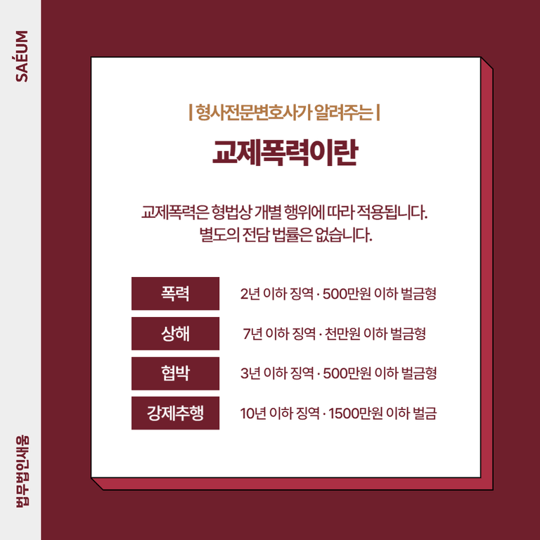 교제폭력은 형법상 폭행, 상해, 협박, 강요, 강간, 강제추행 등 개별 행위에 따라 적용됩니다. 별도의 전담 법률은 없습니다.
