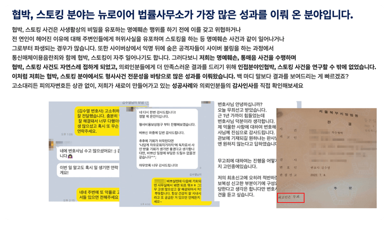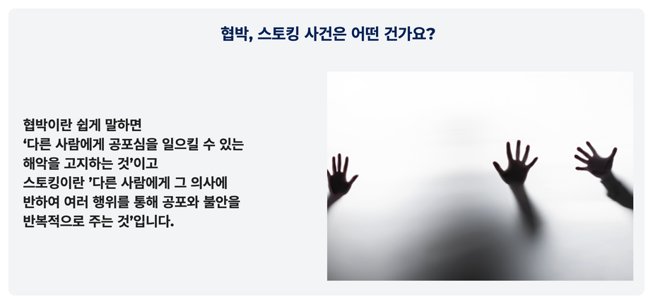 저희가 스토킹, 협박 등 다양한 사건을 방어해 드리고 있기에 여러분들의 마음을 잘 알고 있습니다.