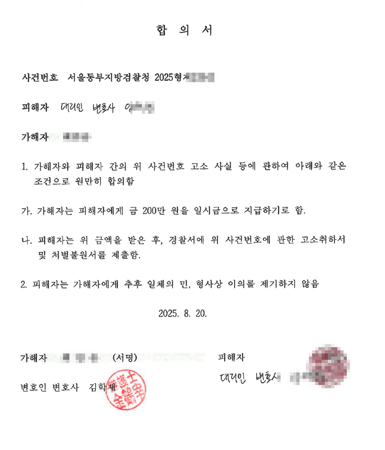 [승소] 2025년 8월 20일 명예훼손 사건 합의 완료