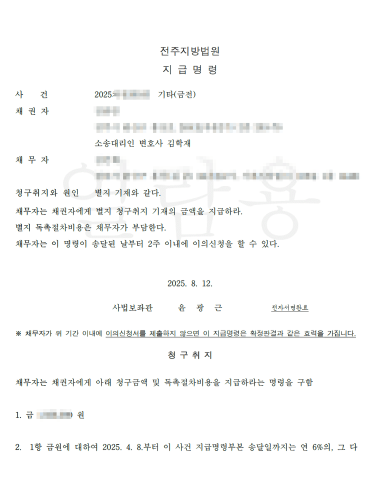 [전부승소] 2025년 8월 12일 금전지급명령