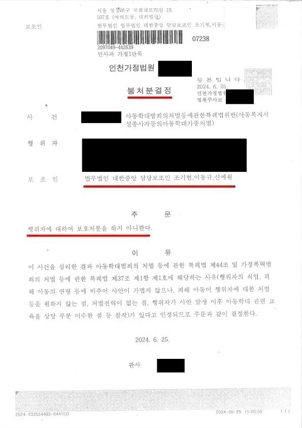 재판부는 이동규 변호사의 주장을 받아들여 불처분 결정을 내렸습니다.