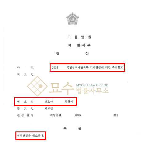 고등법원은 원심의 국민참여재판 배제결정을 직권으로 취소하고 항고를 인용, 국민참여재판으로 사건을 다시 진행할 수 있게 되었습니다.
