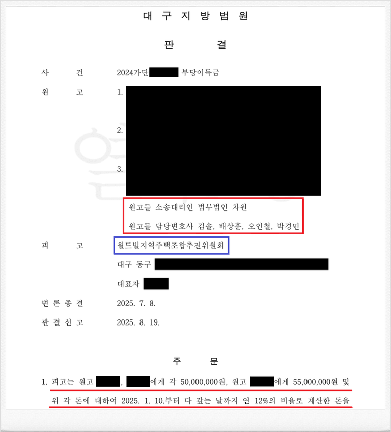 그러나 이후 피고 월드빌지역주택조합추진위원회의 사업은 계획대로 추진되지 않았고, 이에 의뢰인들께서는 각 납부한 분담금 반환을 구하는 민사소송을 정식으로 진행하길 원하셨습니다.