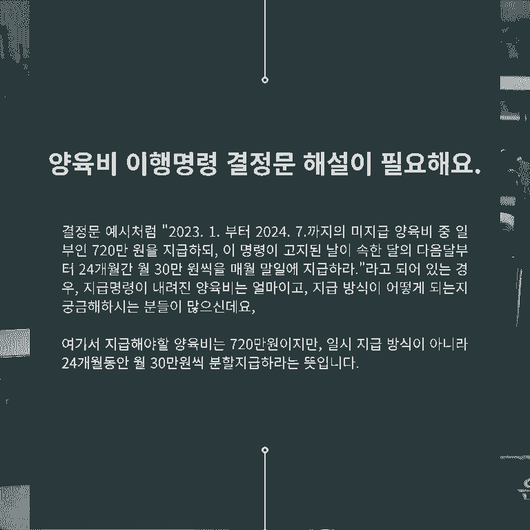 그런데 위 결정문 예시처럼 "2023. 1. 부터 2024. 7.까지의 미지급 양육비 중 일부인 720만 원을 지급하되, 이 명령이 고지된 날이 속한 달의 다음달부터 24개월간 월 30만 원씩을 매월 말일에 지급하라."라고 되어 있는 경우, 지급명령이 내려진 양육비는 얼마이고, 지급 방식이 어떻게 되는지 궁금해하시는 분들이 많으신데요,