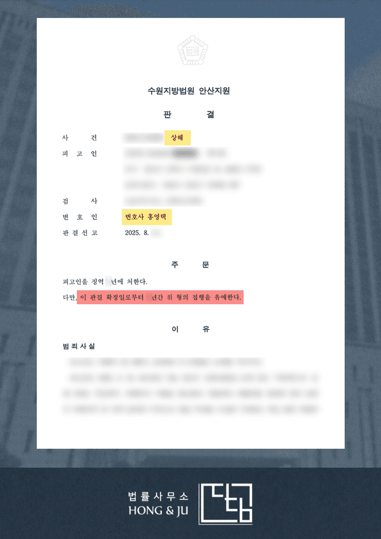이로써 동종 전과가 있던 의뢰인의 상해죄 사건은 집행유예 선고로 법정 구속 없이 조속히 마무리 됐습니다.