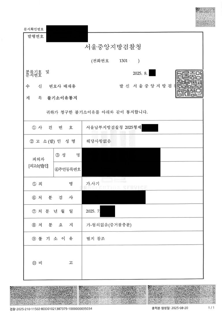 서울남부지검은 “피의자에게 기망하여 편취하려는 범의가 있었다고 보기 부족하고 달리 이를 인정할 뚜렷한 증거가 없다”는 이유로 ‘혐의없음(증거불충분)’불기소 처분을 내렸습니다.