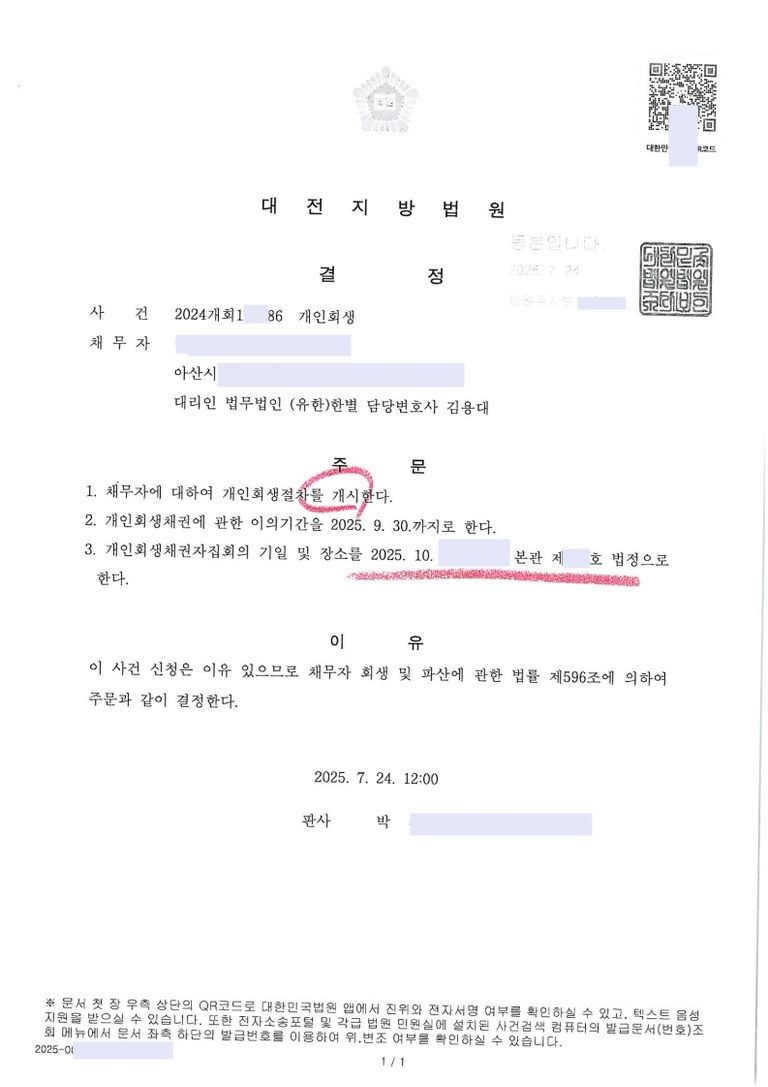 법원이 의심할 수 밖에 없는 상황으로 인하여 일반적인 처리기간보다 신청부터 개시결정까지 상당히 오랜 기간이 걸렸습니다. 또한 생계비를 감액하고 변제기간을 늘리기는 하였으나 결과적으로 이자 약 1천만원 전액탕감과 원금은 70%를 탕감 받게 되었습니다.