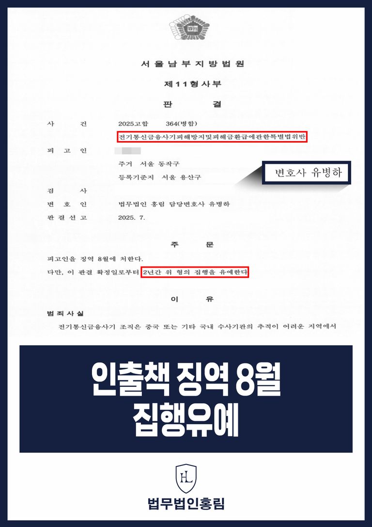법무법인 홍림의 끈질긴 노력과 체계적인 법률 조력의 결과, 재판부는 피고인이 보이스피싱 범행에 대한 고의가 없었음을 인정하고 피해자와의 합의 및 기타 유리한 양형 요소들을 종합적으로 고려하여 징역 8개월에 집행유예 2년을 선고했습니다. 이는 피고인이 실형을 면하고 일상으로 복귀할 수 있게 된 의미 있는 결과입니다.
