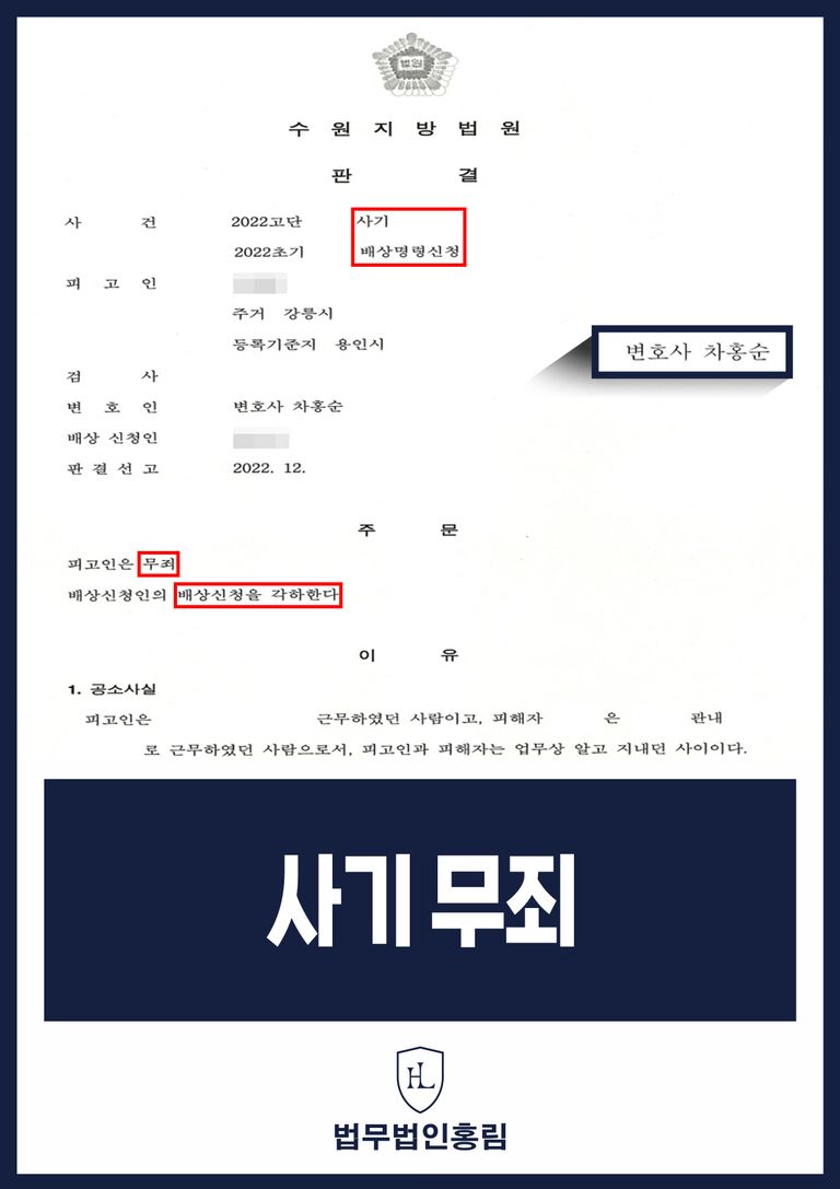 법무법인 홍림 변호인의 체계적인 변론과 증거 제출 덕분에 재판부는 변호인의 주장을 모두 받아들였습니다. 법원은 의뢰인이 돈을 빌릴 당시 변제 능력과 의사가 모두 있었다고 판단하며, 사기죄의 핵심 구성 요건인 기망 행위가 없었다고 판결했습니다. 이로써 의뢰인은 무죄를 선고받았고, 오랜 기간 겪었던 법적 고통에서 벗어날 수 있었습니다.