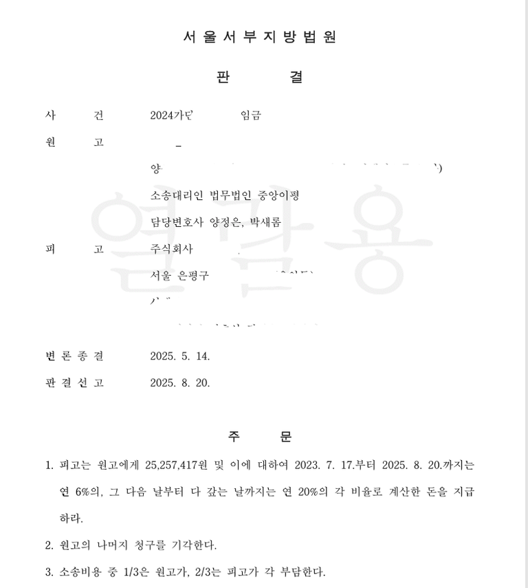 노동청에서 불인정 받은 임금에 대해서 법원에서 힘들게 모두 인정받은 사례입니다.