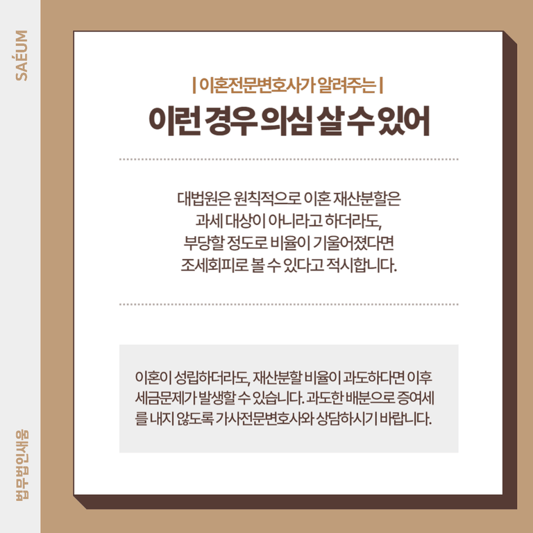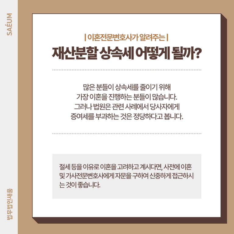 실제로 법원은 관련 사례에서 황혼이혼을 통해 상속세를 줄이려 한 당사자에게 증여세를 부과하는 것이 정당하다고 판시한 바 있습니다. 세금 문제로 인해 이러한 방법을 고려한다면, 법을 악용한 것으로 간주될 수 있으므로 사전에 전문변호사에게 자문을 구하여 신중하게 판단하셔야 합니다.