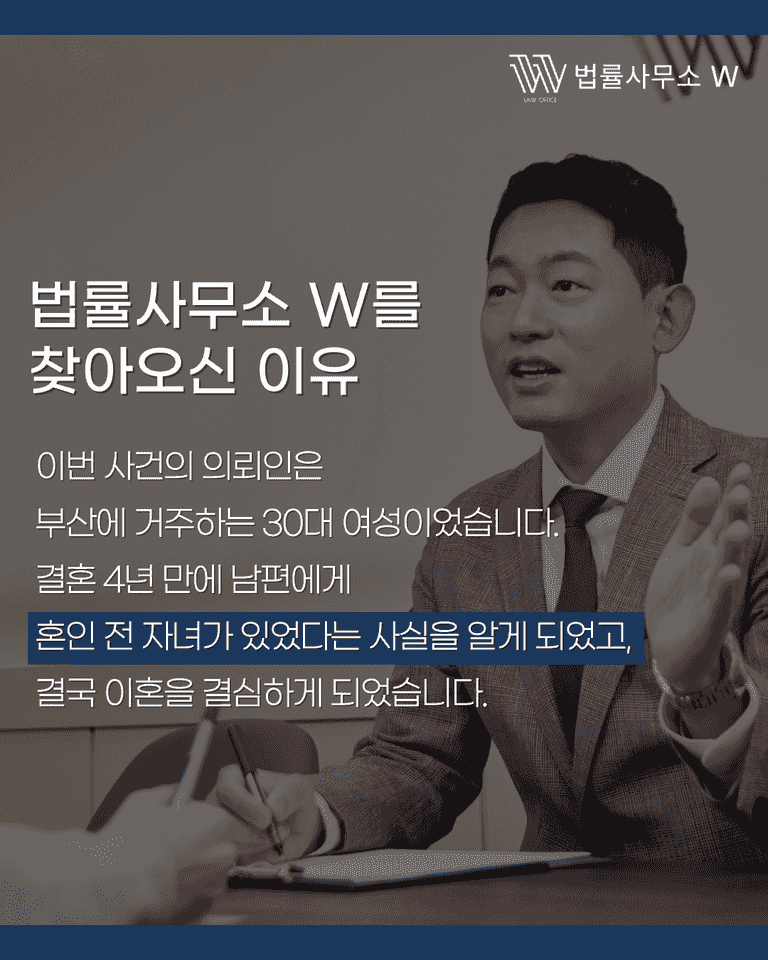 의뢰인은 부산에 거주하는 30대 여성으로, 결혼 4년 만에 남편에게 혼인 전 자녀가 있었다는 사실을 알게 되었습니다. 큰 충격을 받은 의뢰인은 결국 이혼을 결심했지만, 문제는 재산분할이었습니다. 현재의 재산은 모두 남편 명의로 되어 있었고, 결혼 당시 의뢰인은 별다른 자산이 없는 상태였습니다. 의뢰인은 “혹시 재산분할을 전혀 못 받는 건 아닐까” 하는 불안감 속에서 저희를 찾아오셨습니다.