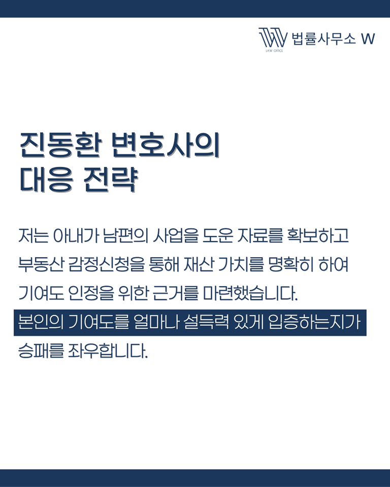 이를 위해 부동산 감정신청을 통해 재산 가치를 명확히 하고, 의뢰인이 사업 운영 과정에서 매출 확대와 재산 형성에 중요한 역할을 했다는 자료를 확보했습니다. 또한 사업 관련 서류와 증인을 통해 의뢰인이 사실상 동업자처럼 활동했다는 점을 강조했습니다.