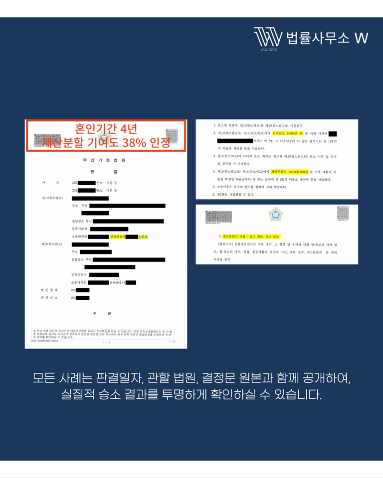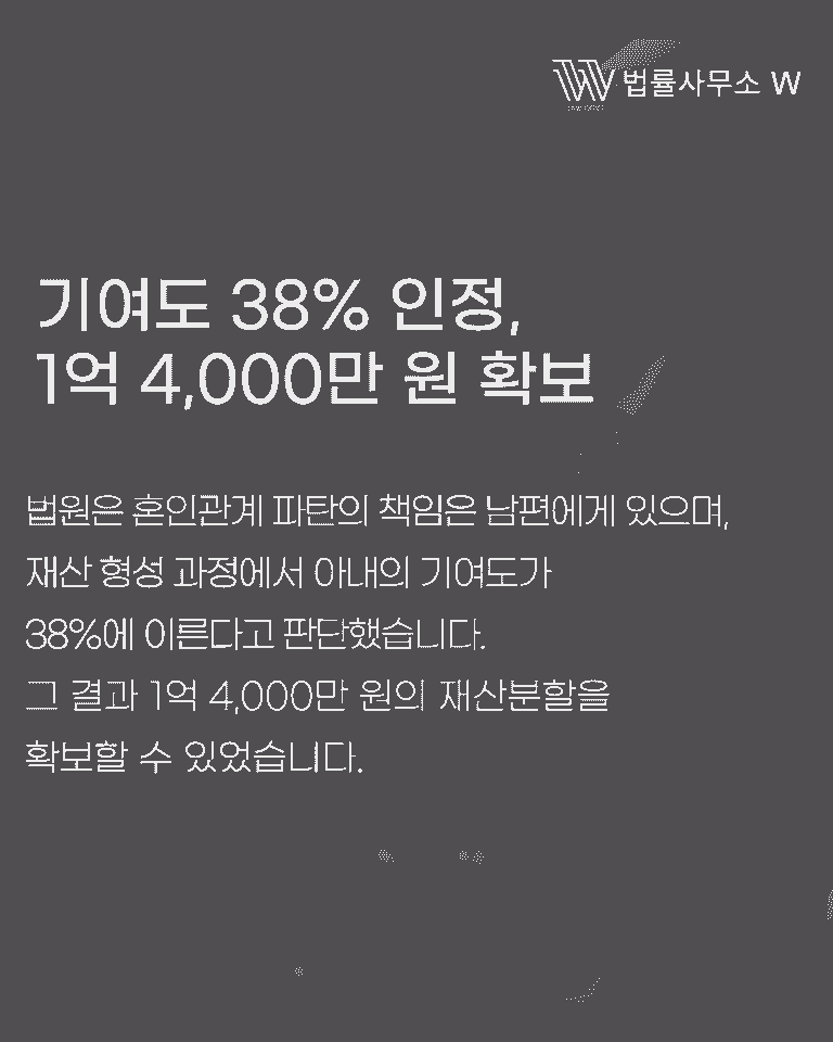 따라서 혼인기간이 짧고 재산이 배우자 명의로 되어 있더라도, 본인의 기여도를 체계적으로 입증하면 재산분할을 받을 수 있습니다. 오늘은 이와 관련해 실제로 혼인기간이 4년으로 짧았음에도 불구하고 재산분할에서 38%의 기여도를 인정받아 1억 4,000만 원을 확보한 사례를 소개해 드리겠습니다.