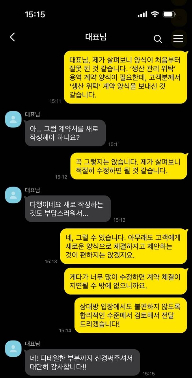 계약서를 받아서 확인해보니, 생산 관리 업무 위탁 계약이 아니라 생산 위탁 계약 양식이었습니다.